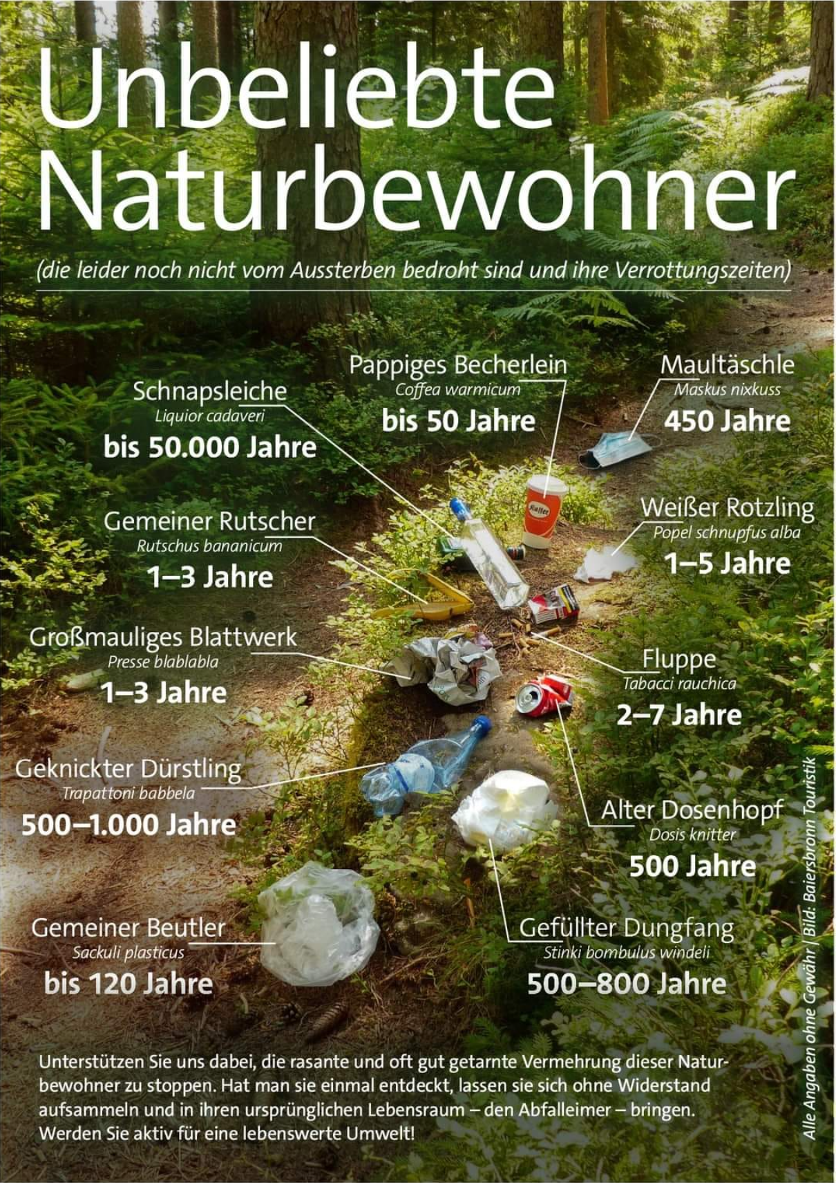 Die Zeitangaben sind nur grobe Anhaltspunkte. Die Zersetzung einer Plastikflasche in bewegtem Salzwasser unter Einfluss der Sonne erfolgt verständlicherweise schneller als im Waldboden. Bei vielen Materialien, die erst seit wenigen Jahrzehnten existieren, fehlen schlicht die Erfahrungswerte.